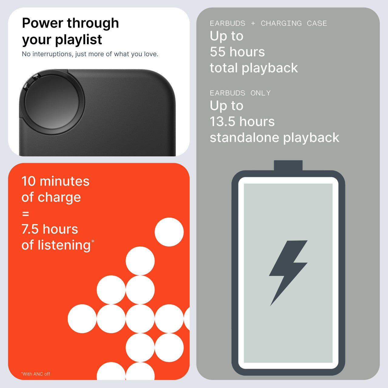 - All-Day Battery Life & Fast Charging: 13.5 hours of playback on a single charge & 55 hours with the case (ANC off). A 10-minute charge gives you 7.5 hours of listening