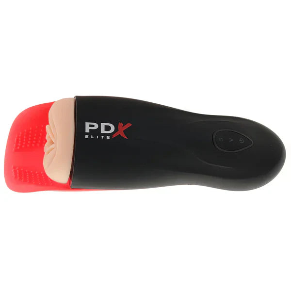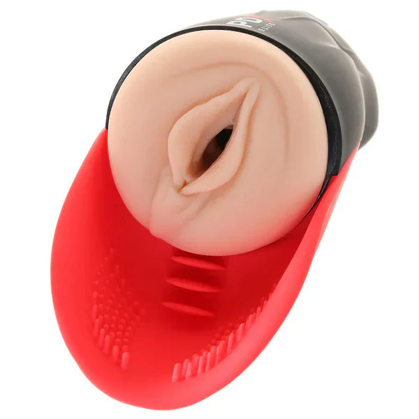 Waiting inside (and a little outside)a sturdy case complete with travel-friendly cap, the F**k-O-Matic's super soft Fanta Flesh vagina sleeve invites you into a veritable wonderland of sucking, vibrating action. Once activated with a dedicated 'S' button, five possible rhythms of suction get to work engulfing every inch of your shaft. For a hit or two of vibration, press the 'V' button to explore ten built-in modes. Not only will you feel the buzz from deep inside, you'll also feel it against your balls, thanks to an attached silicone tongue tickler below. Vibration is synchronized between both internal and external motors.